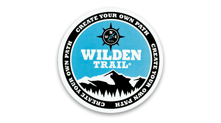 This sticker will tell the world where you stand (firmly on soil and snow) and help get the word out about the Wilden Trail Way. Mountains and treetops against a clear blue sky.